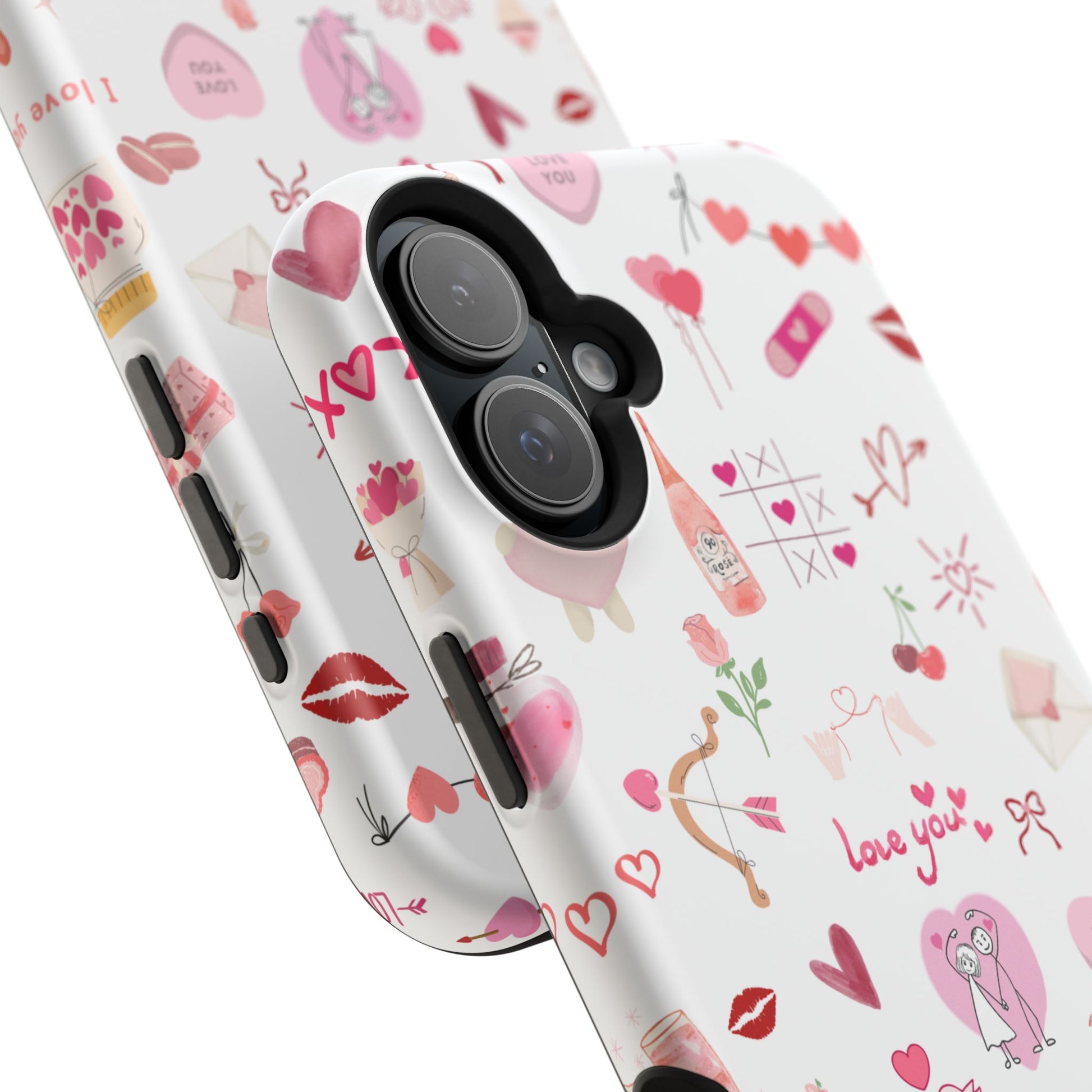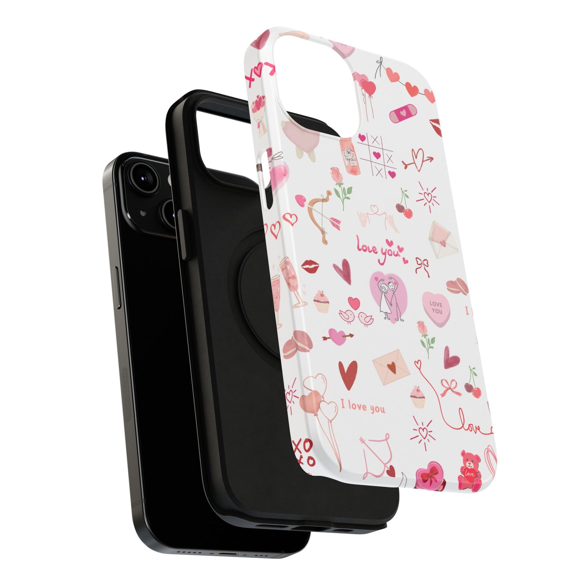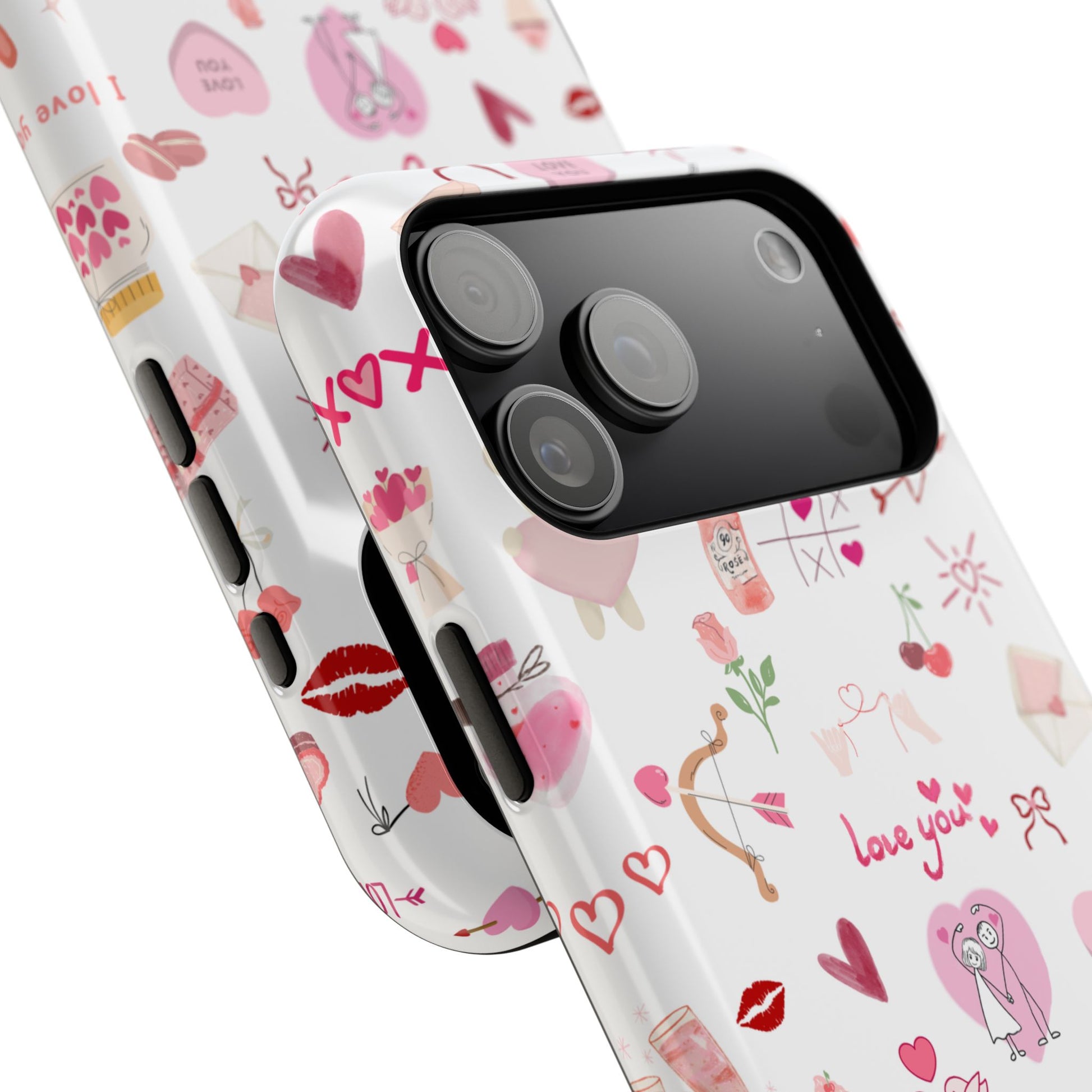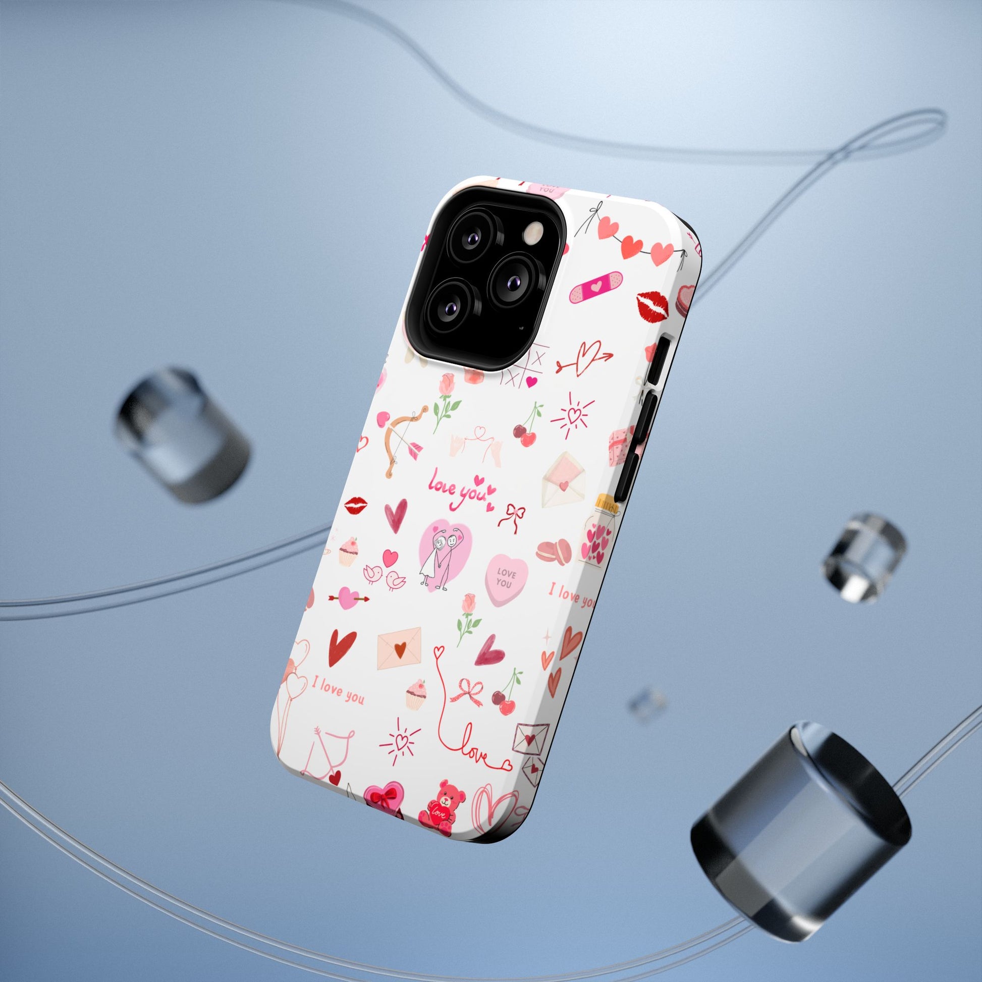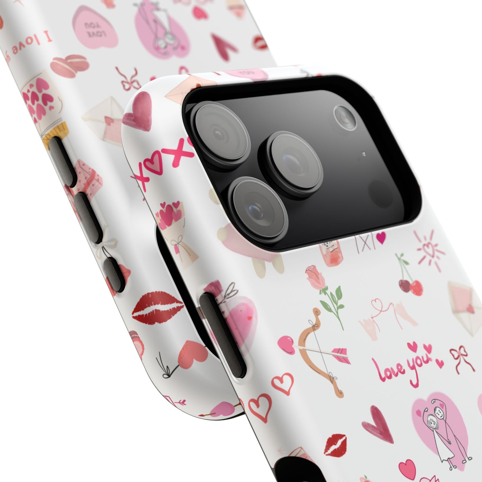 A slim, impact-resistant phone case wrapped in playful, hand-drawn love motifs — tiny hearts, kisses, love notes, bows, and pastel doodles scatter across a soft background. It feels light in the hand yet built to shield your phone from everyday bumps with a dual-layer construction. The artful, cheerful pattern adds a touch of romance to daily carry, whether you prefer a glossy shine or a muted matte finish. Bright, photo-quality printing keeps the pinks and reds vivid while the removable black TPU liner absorbs shocks and supports wireless charging. This case dresses your phone in a sweet, whimsical vibe that fits into moments of everyday affection and celebration.