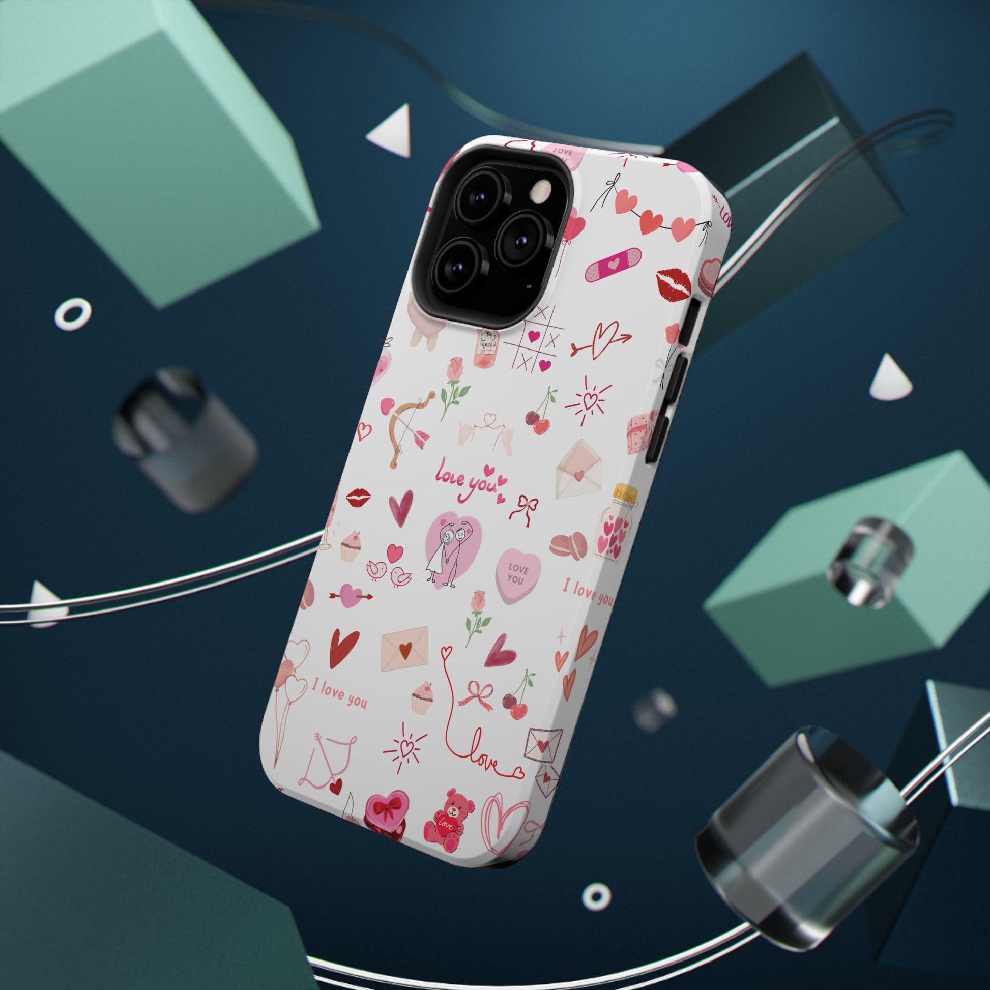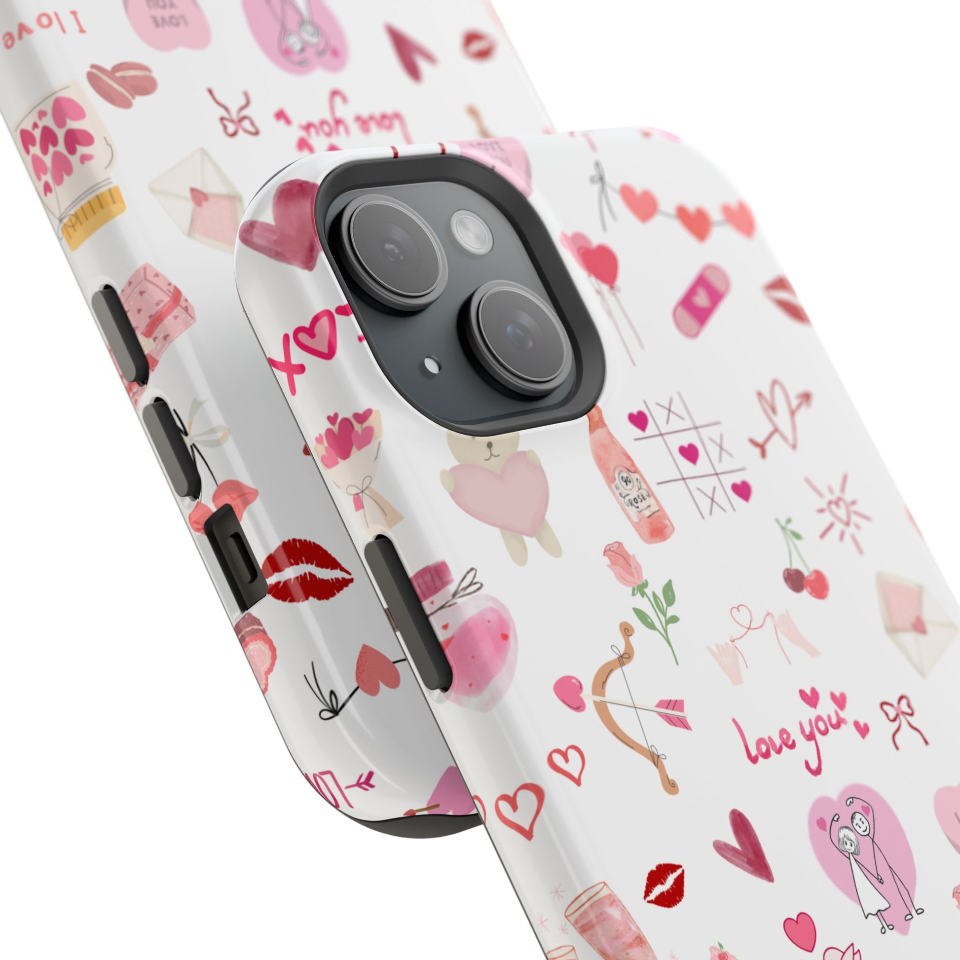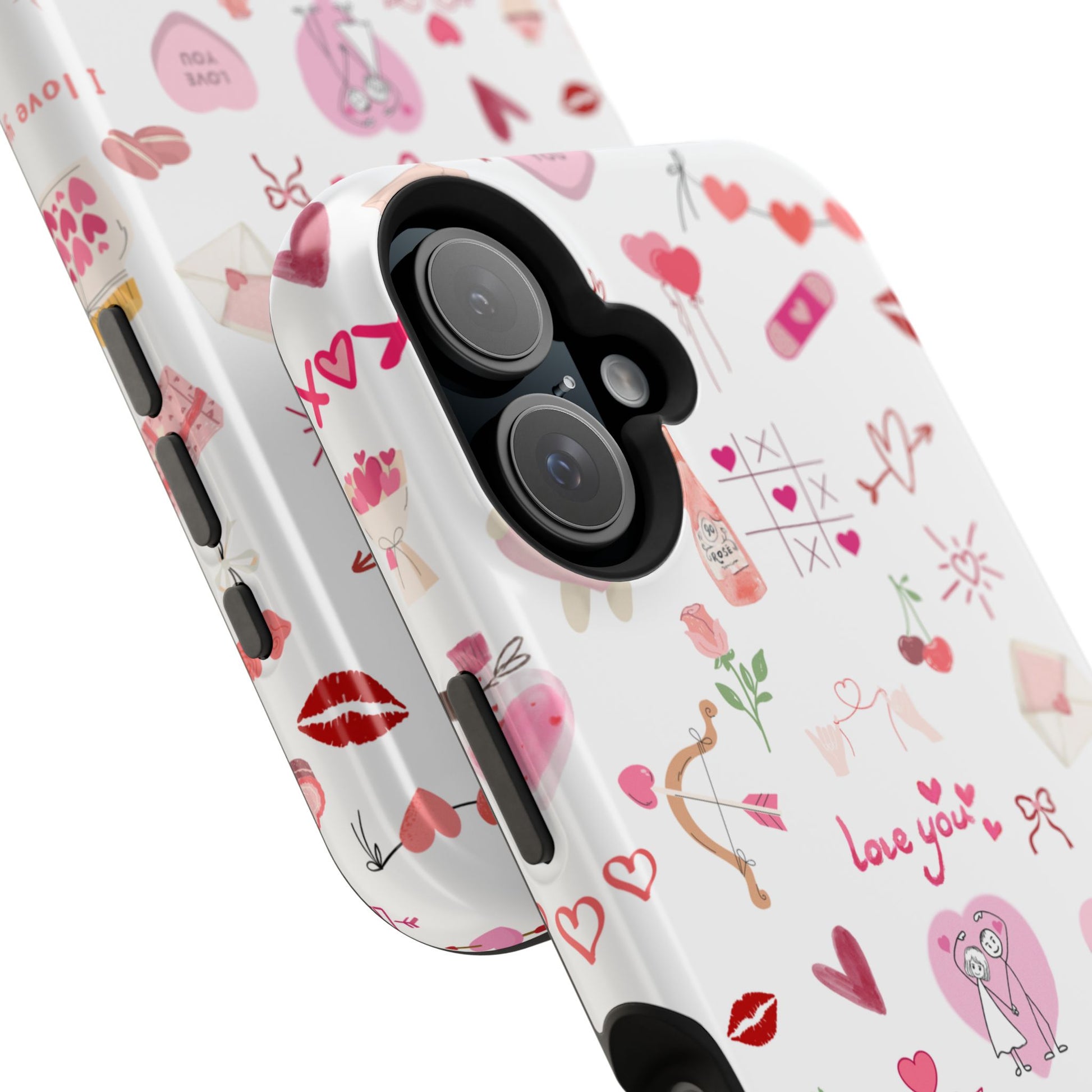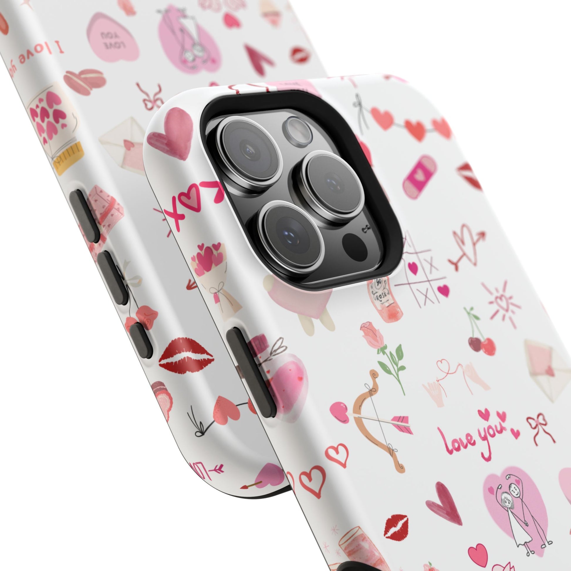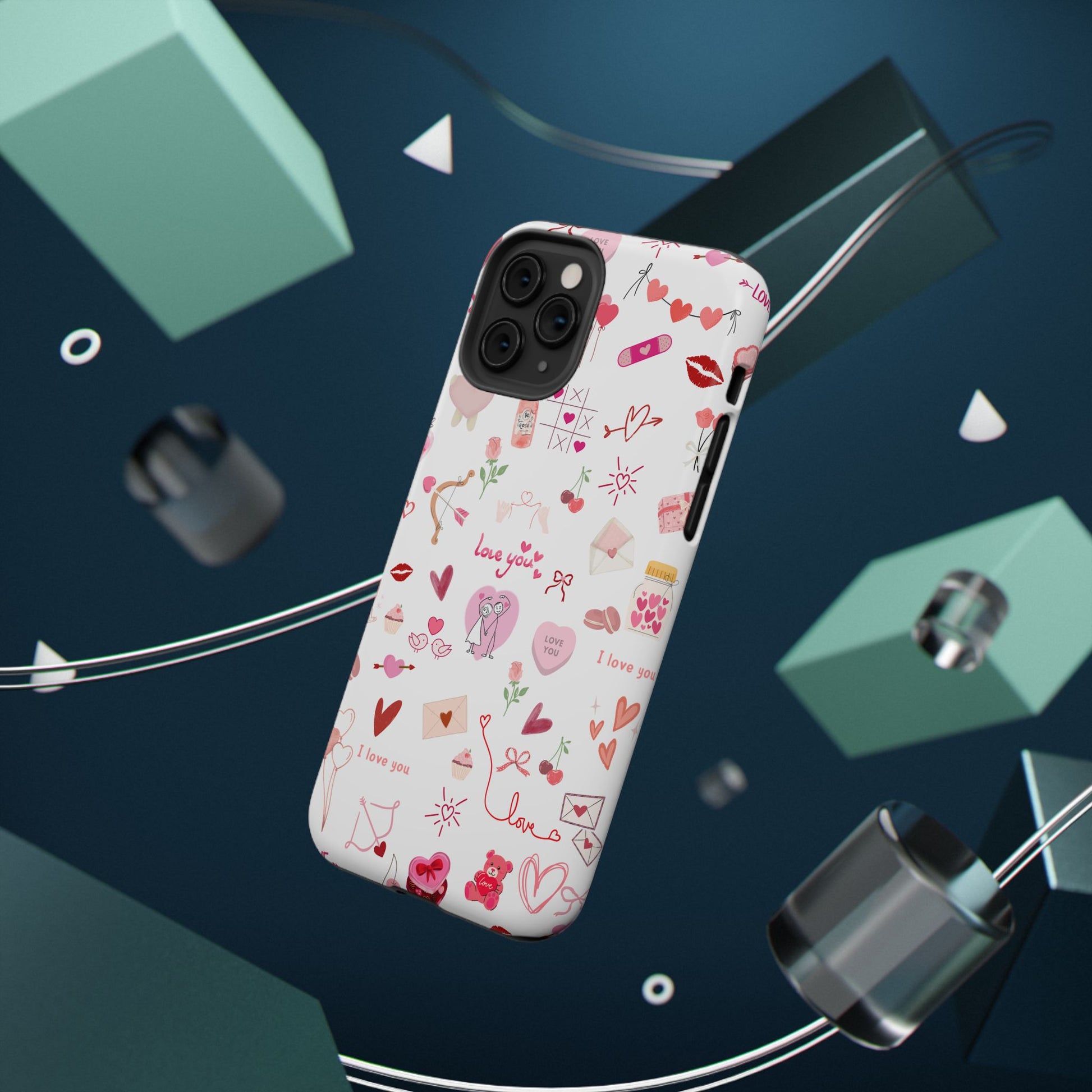 A slim, impact-resistant phone case wrapped in playful, hand-drawn love motifs — tiny hearts, kisses, love notes, bows, and pastel doodles scatter across a soft background. It feels light in the hand yet built to shield your phone from everyday bumps with a dual-layer construction. The artful, cheerful pattern adds a touch of romance to daily carry, whether you prefer a glossy shine or a muted matte finish. Bright, photo-quality printing keeps the pinks and reds vivid while the removable black TPU liner absorbs shocks and supports wireless charging. This case dresses your phone in a sweet, whimsical vibe that fits into moments of everyday affection and celebration.