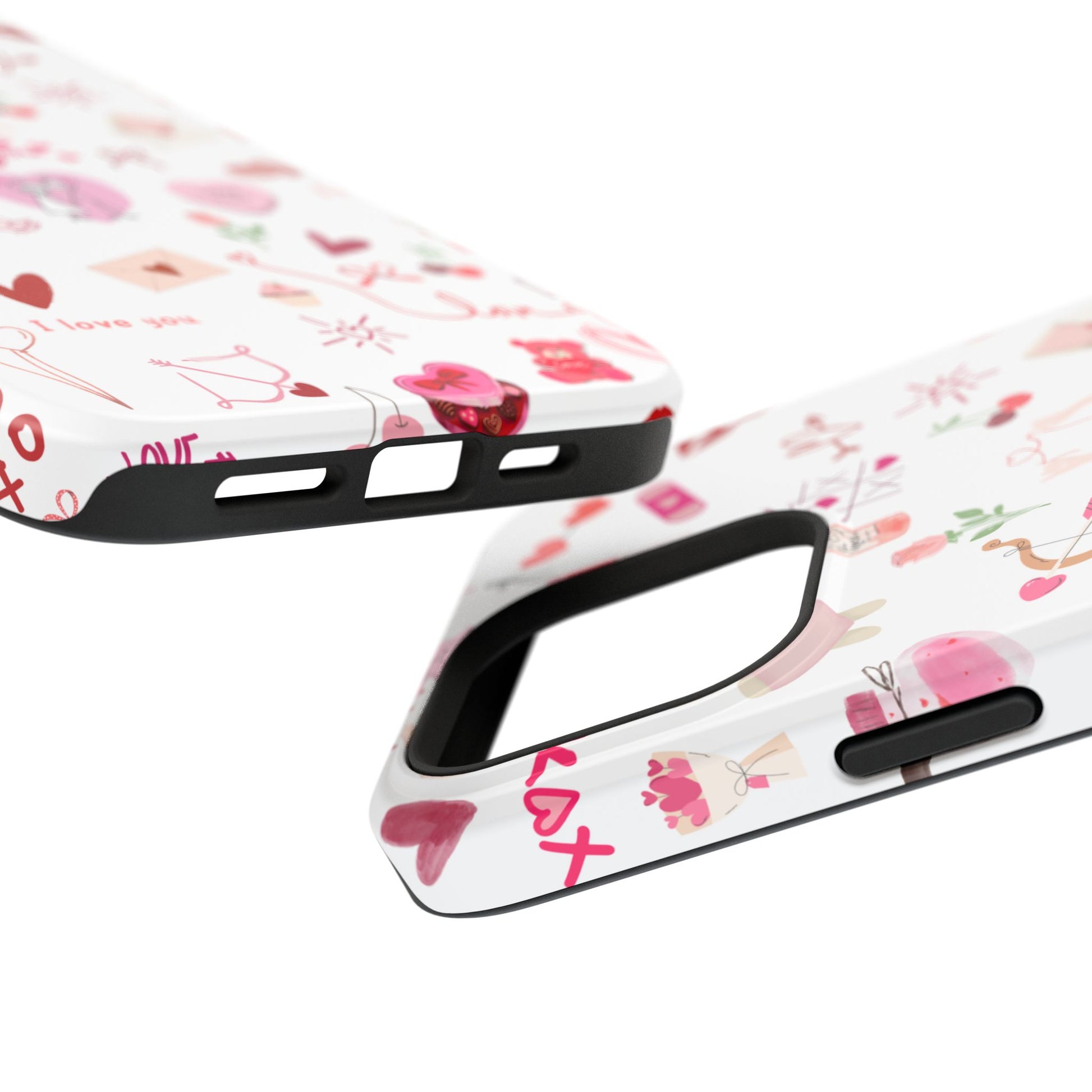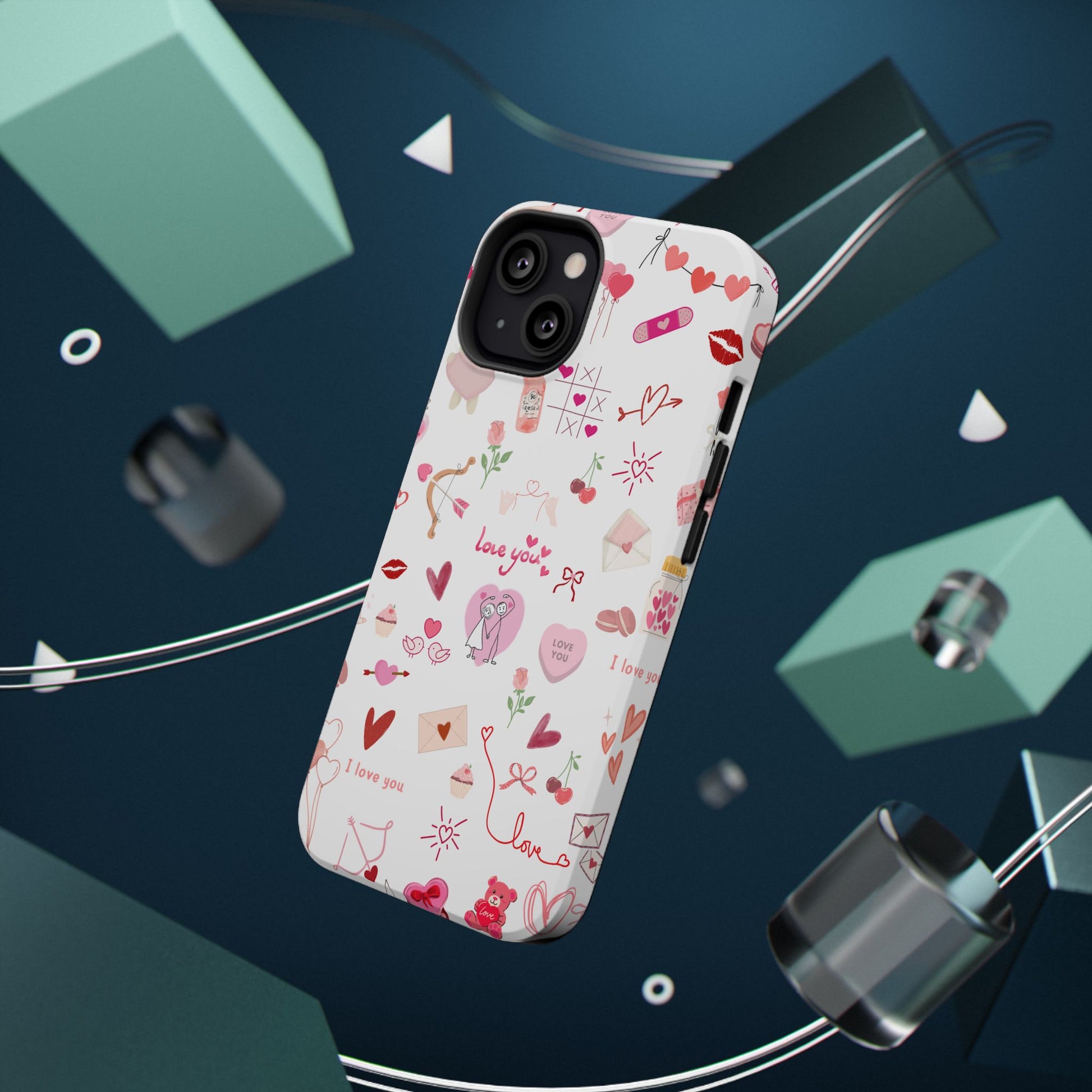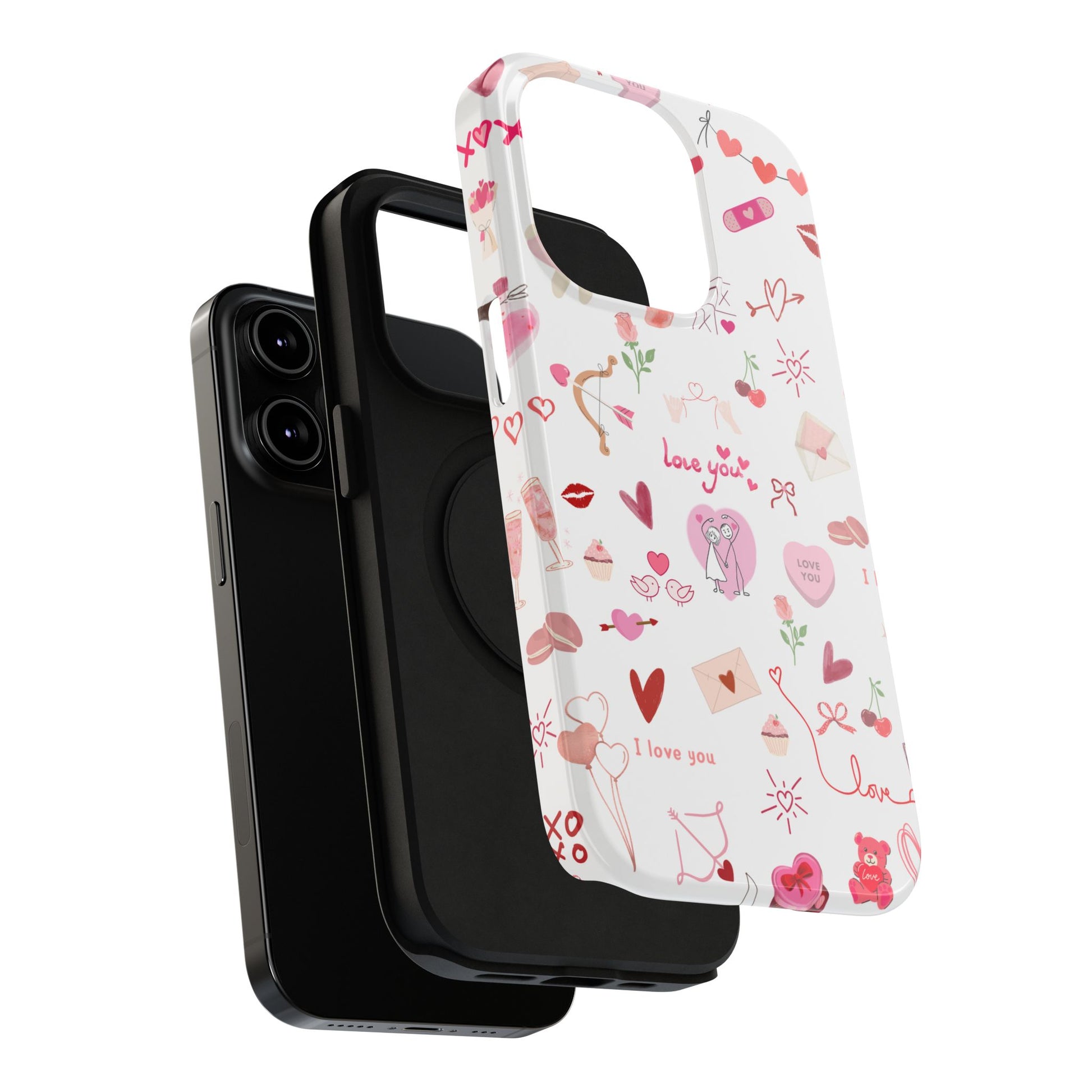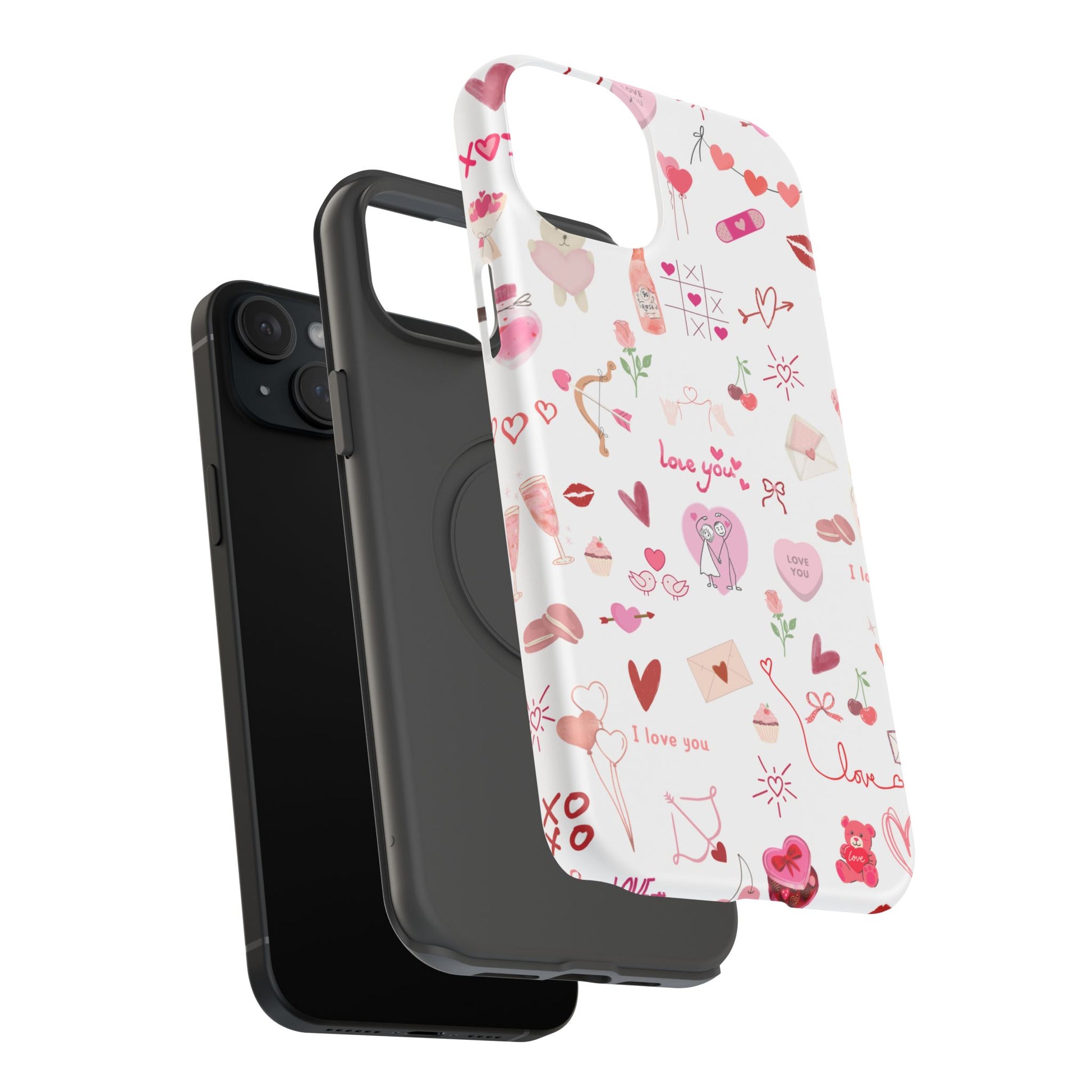 A slim, impact-resistant phone case wrapped in playful, hand-drawn love motifs — tiny hearts, kisses, love notes, bows, and pastel doodles scatter across a soft background. It feels light in the hand yet built to shield your phone from everyday bumps with a dual-layer construction. The artful, cheerful pattern adds a touch of romance to daily carry, whether you prefer a glossy shine or a muted matte finish. Bright, photo-quality printing keeps the pinks and reds vivid while the removable black TPU liner absorbs shocks and supports wireless charging. This case dresses your phone in a sweet, whimsical vibe that fits into moments of everyday affection and celebration.