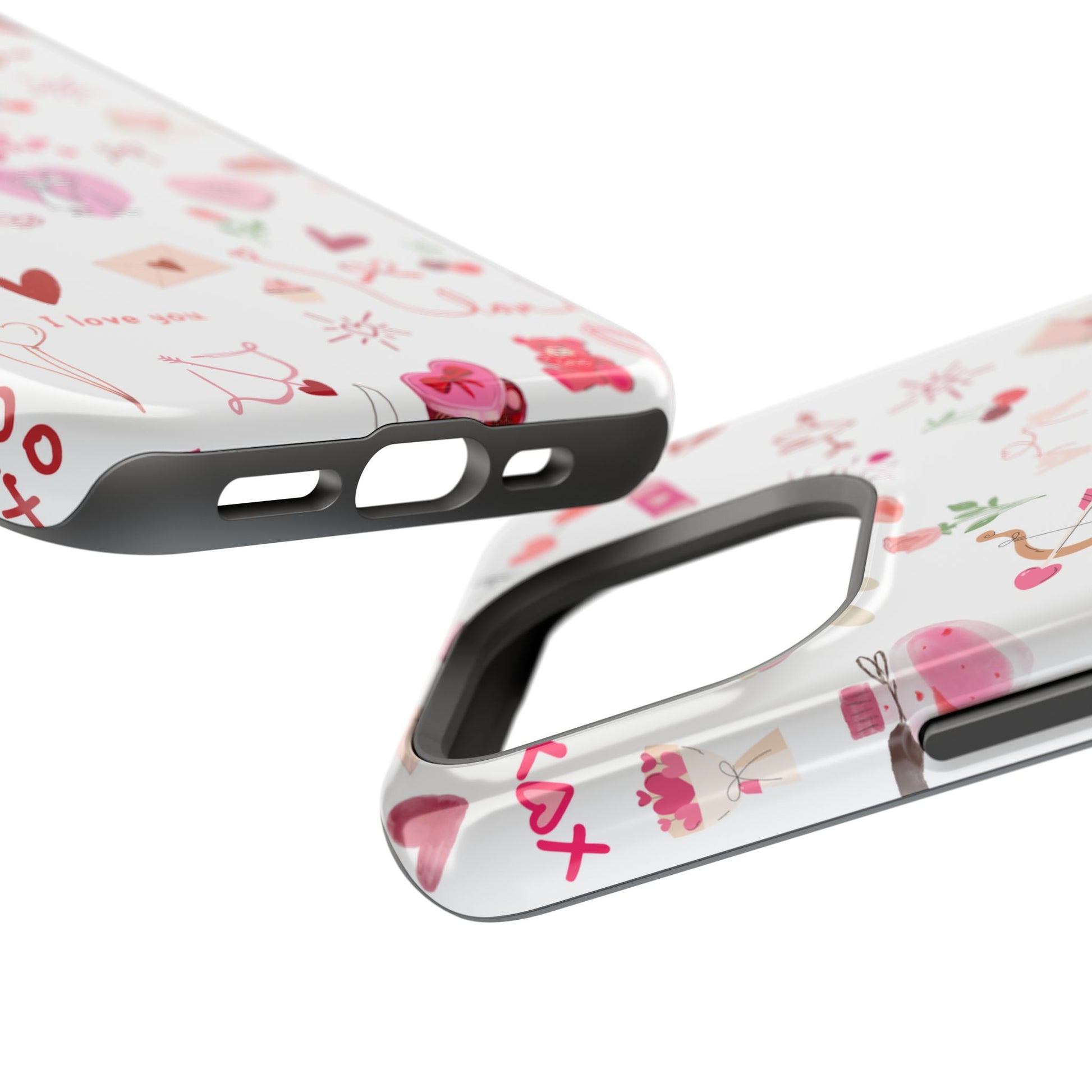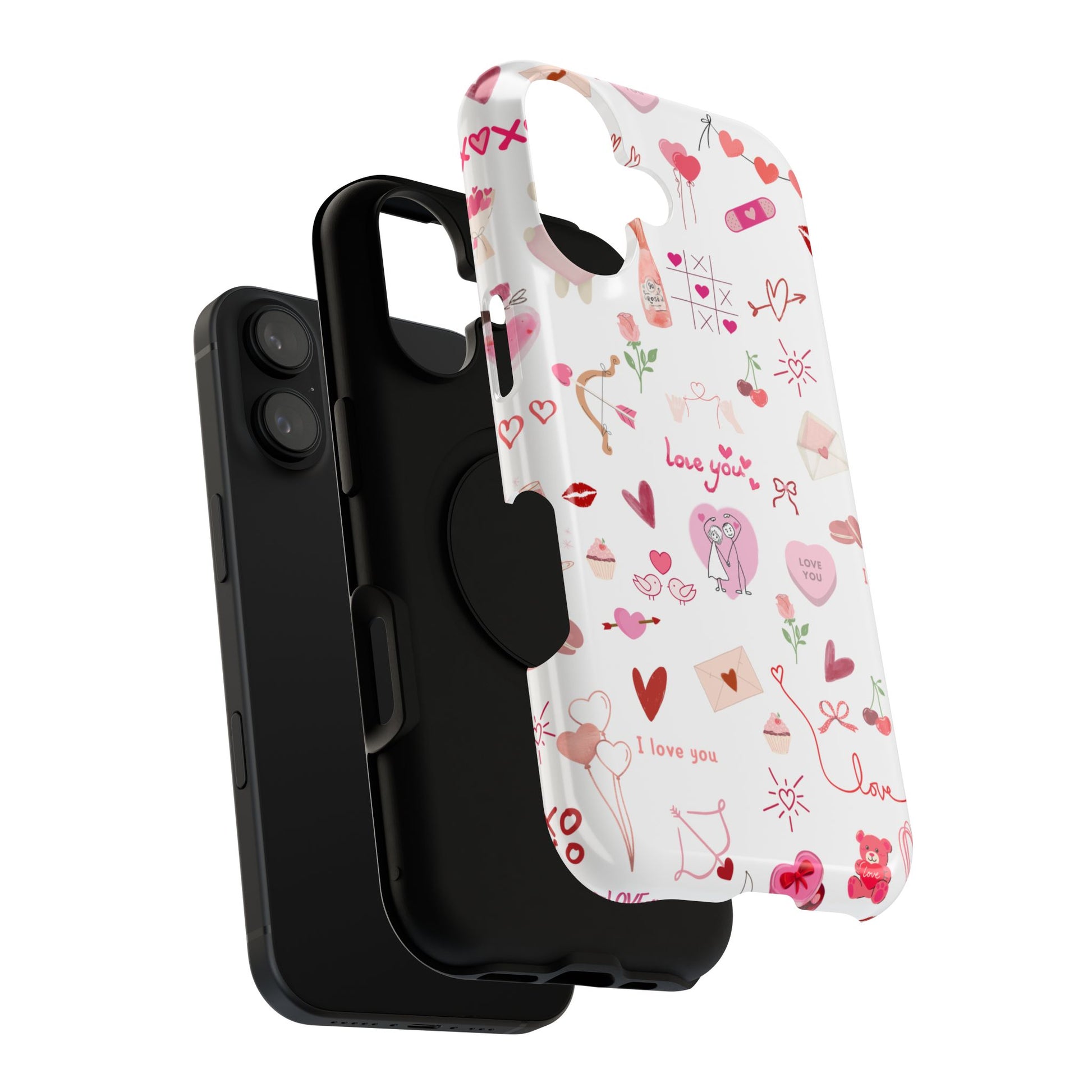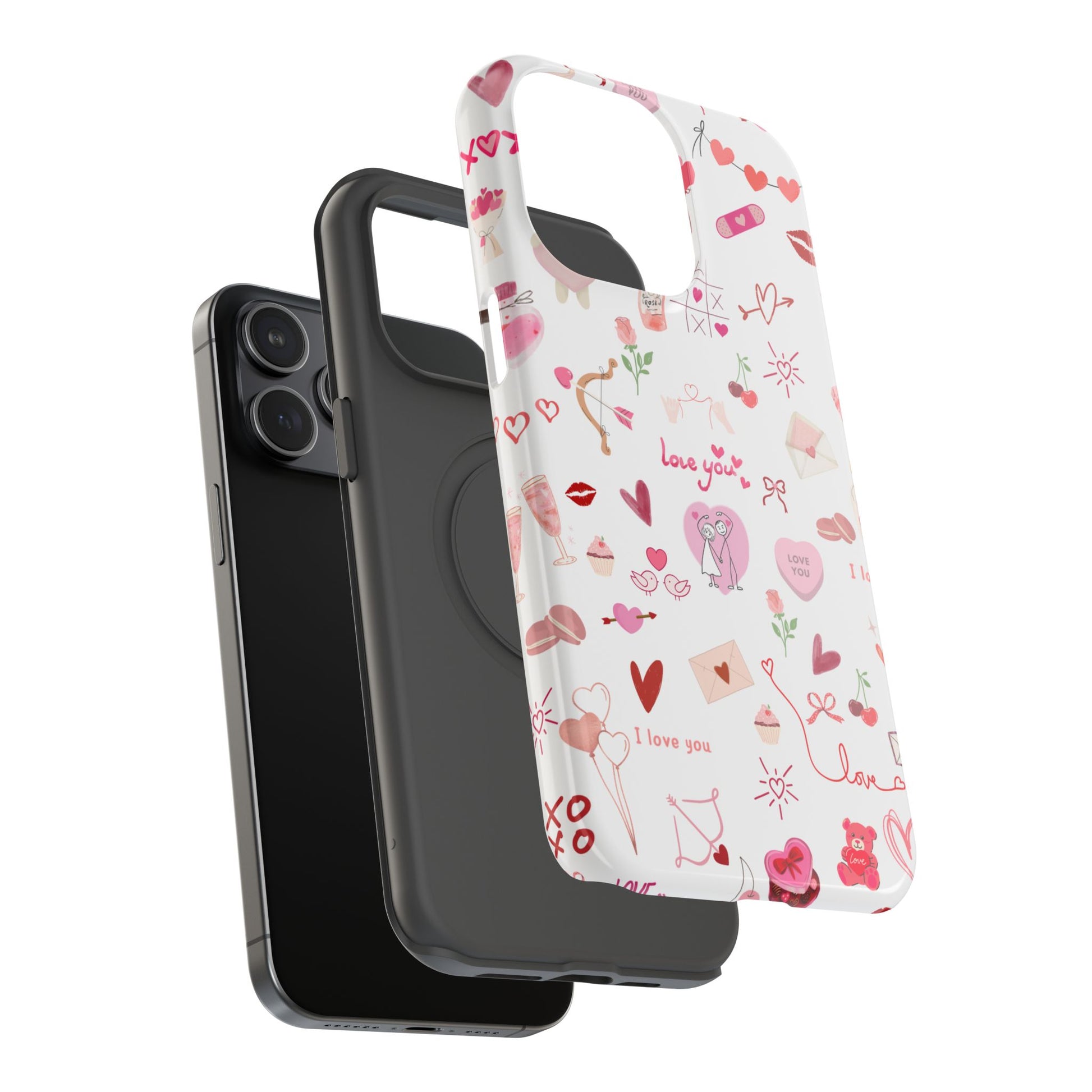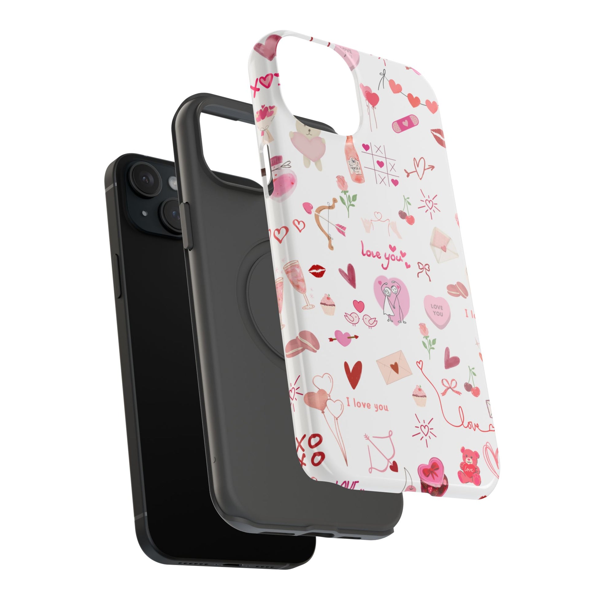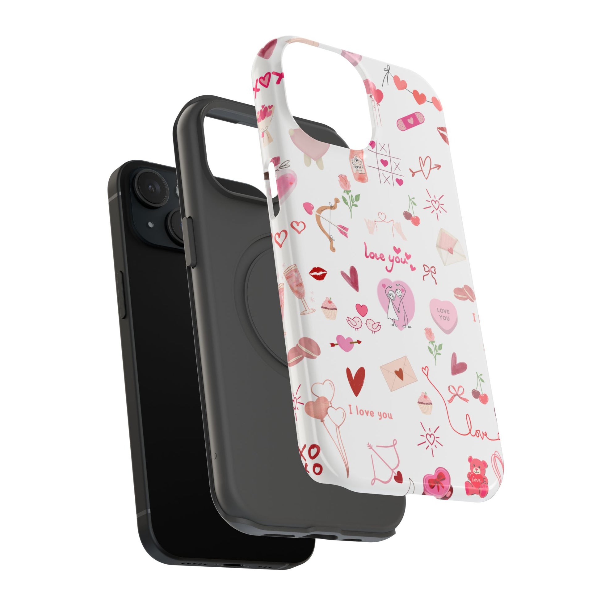 A slim, impact-resistant phone case wrapped in playful, hand-drawn love motifs — tiny hearts, kisses, love notes, bows, and pastel doodles scatter across a soft background. It feels light in the hand yet built to shield your phone from everyday bumps with a dual-layer construction. The artful, cheerful pattern adds a touch of romance to daily carry, whether you prefer a glossy shine or a muted matte finish. Bright, photo-quality printing keeps the pinks and reds vivid while the removable black TPU liner absorbs shocks and supports wireless charging. This case dresses your phone in a sweet, whimsical vibe that fits into moments of everyday affection and celebration.
