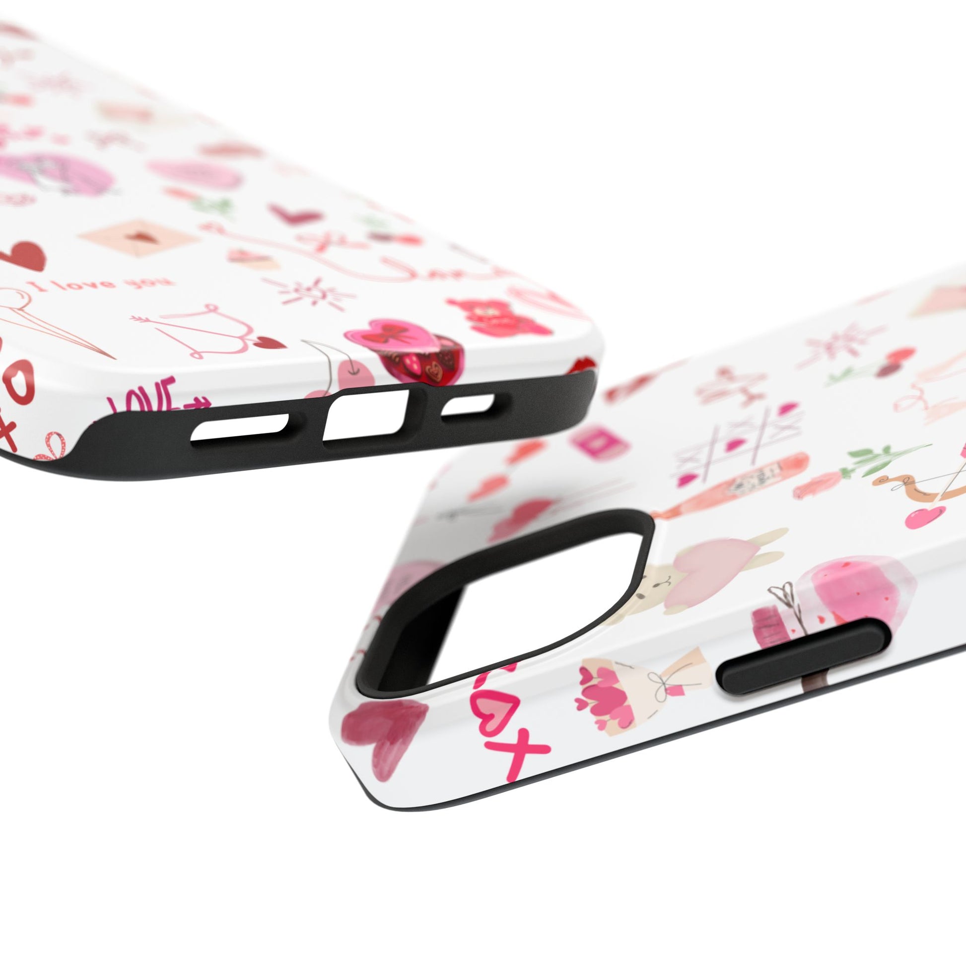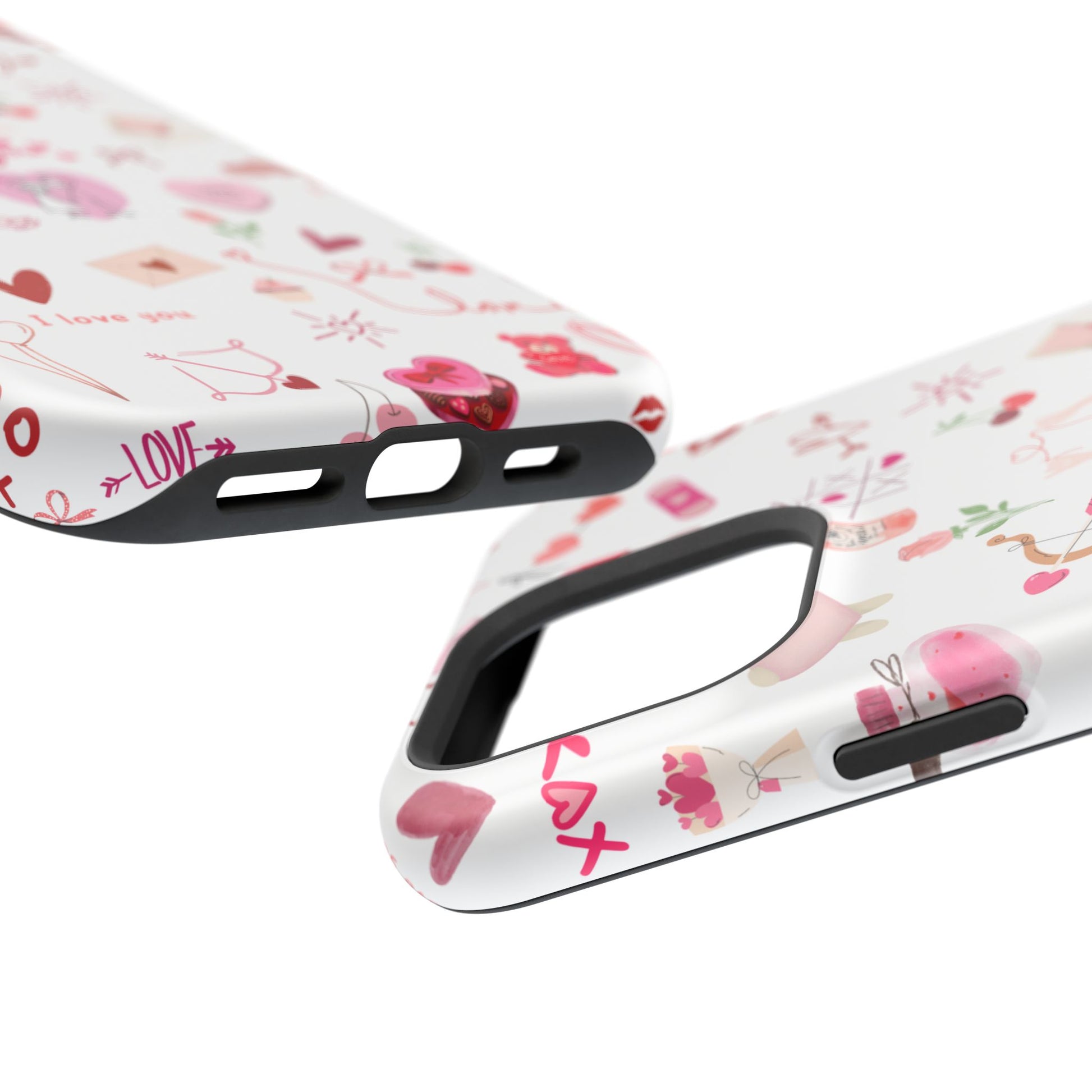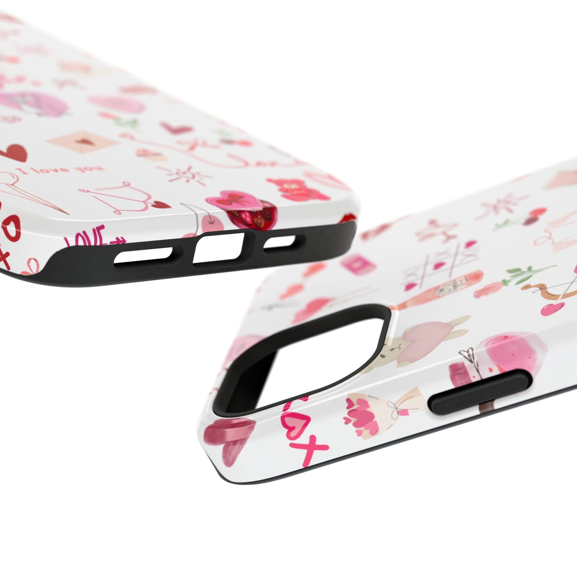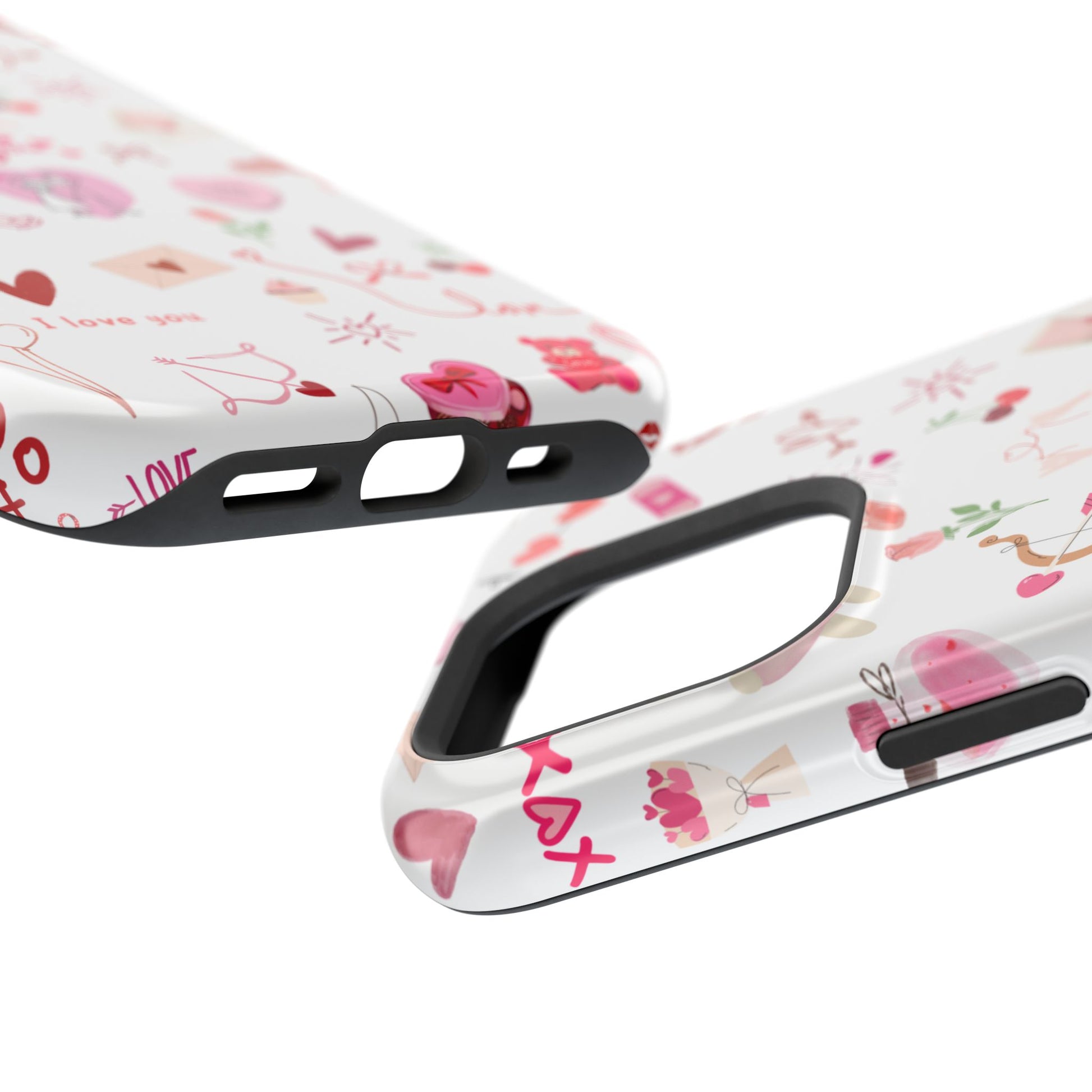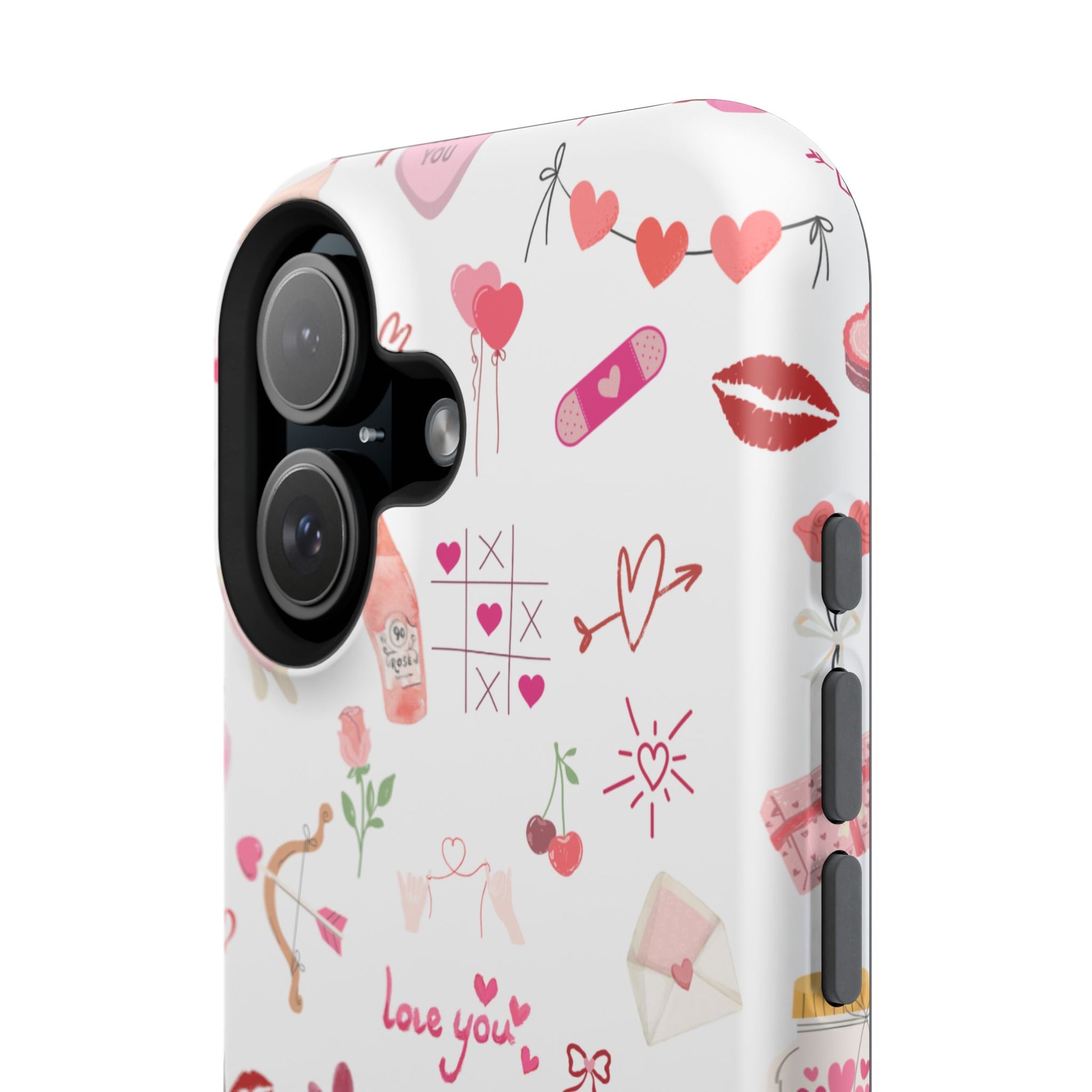 A slim, impact-resistant phone case wrapped in playful, hand-drawn love motifs — tiny hearts, kisses, love notes, bows, and pastel doodles scatter across a soft background. It feels light in the hand yet built to shield your phone from everyday bumps with a dual-layer construction. The artful, cheerful pattern adds a touch of romance to daily carry, whether you prefer a glossy shine or a muted matte finish. Bright, photo-quality printing keeps the pinks and reds vivid while the removable black TPU liner absorbs shocks and supports wireless charging. This case dresses your phone in a sweet, whimsical vibe that fits into moments of everyday affection and celebration.