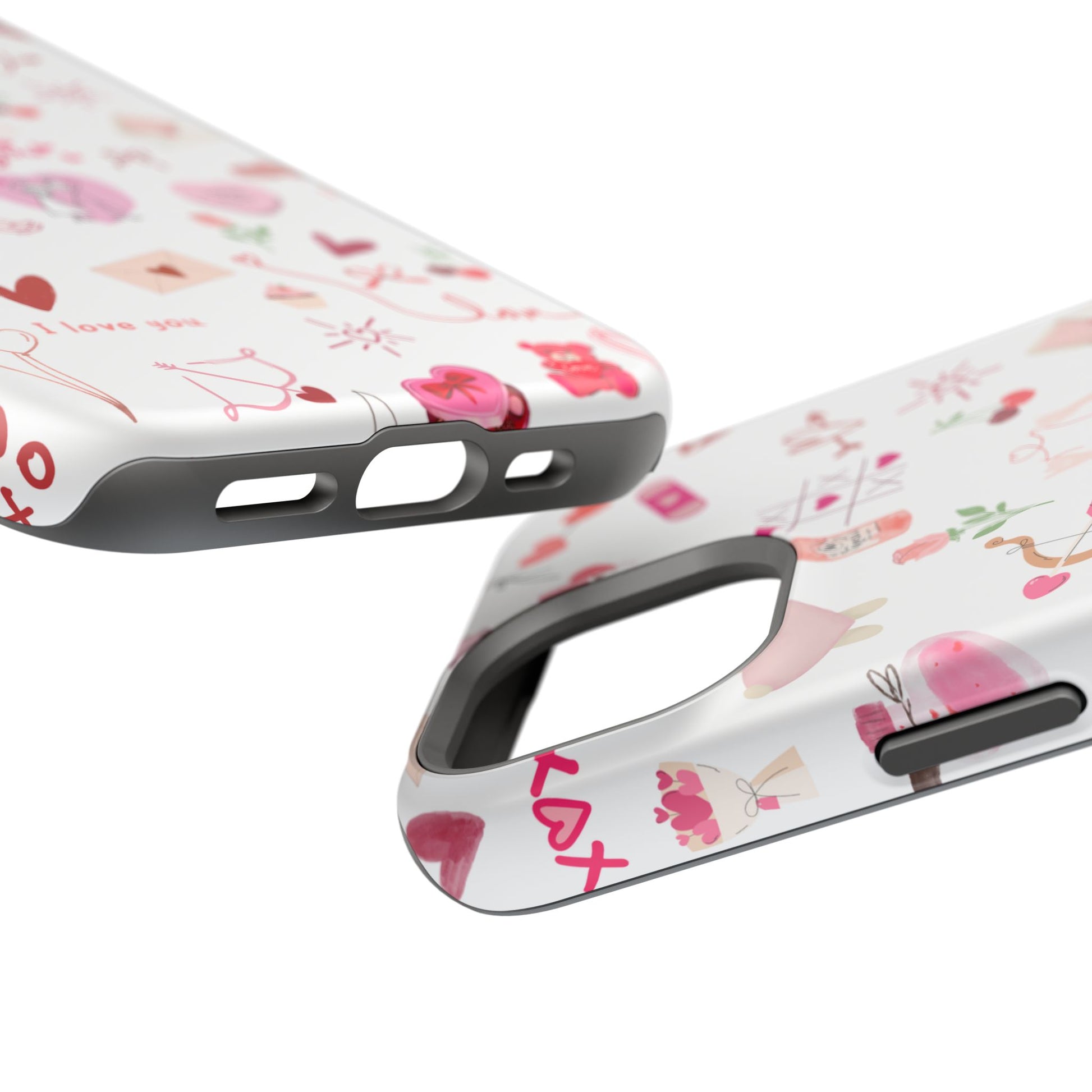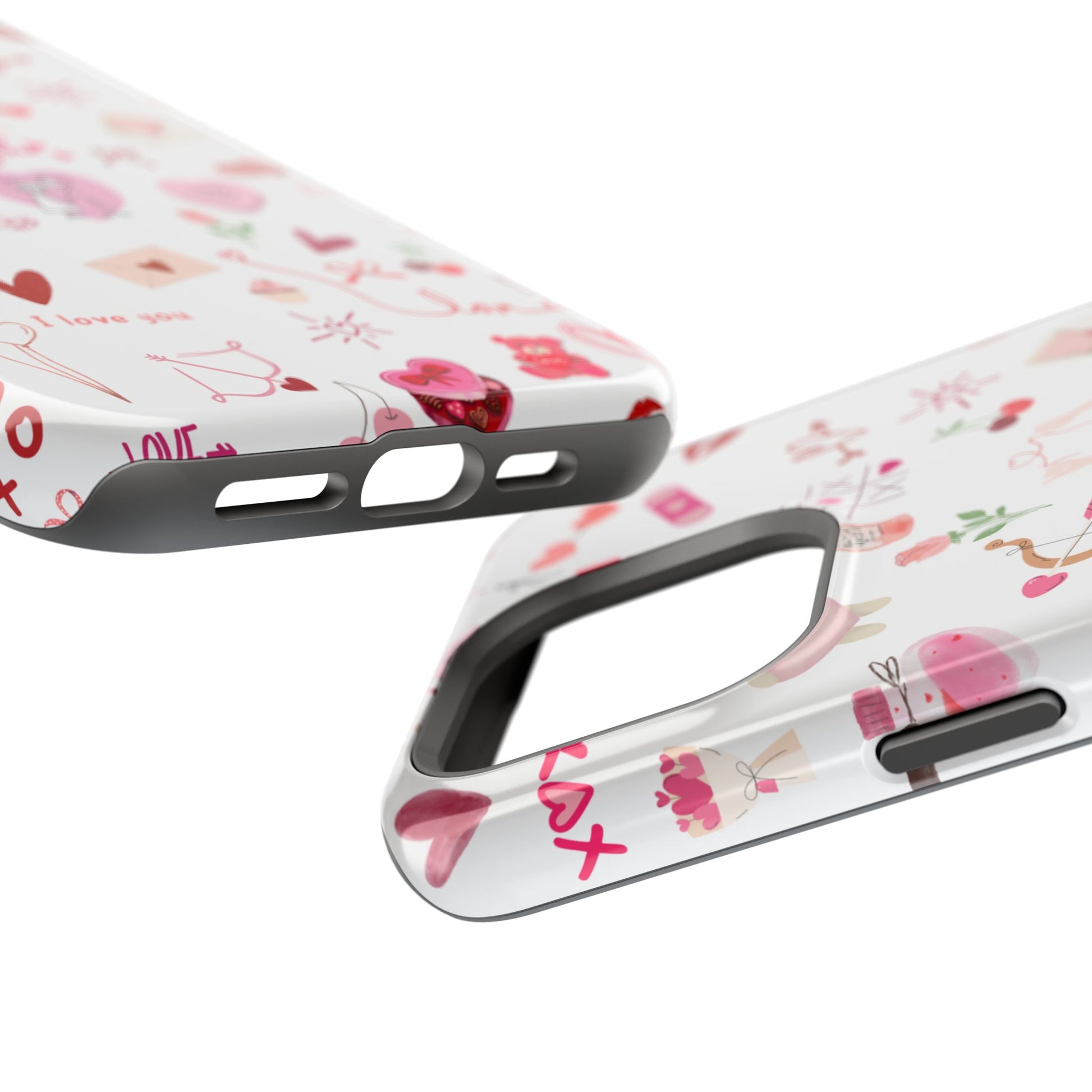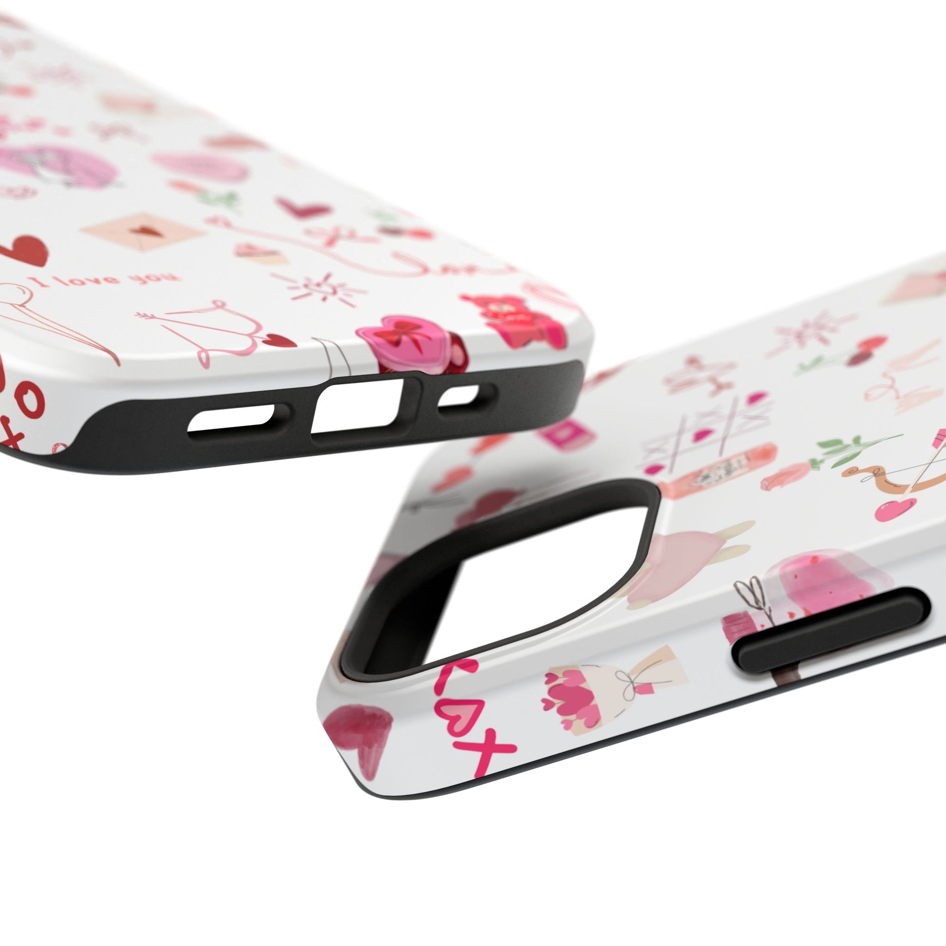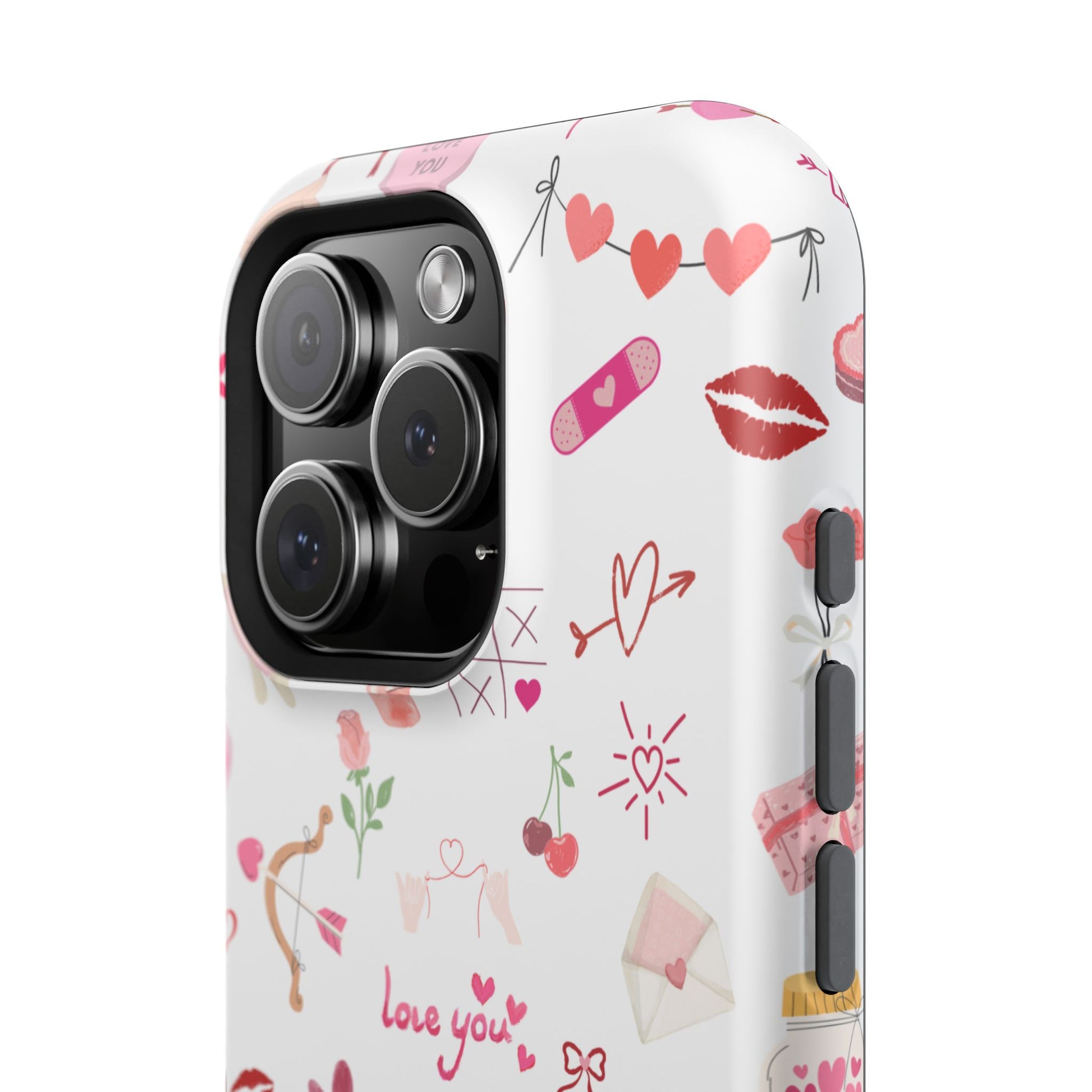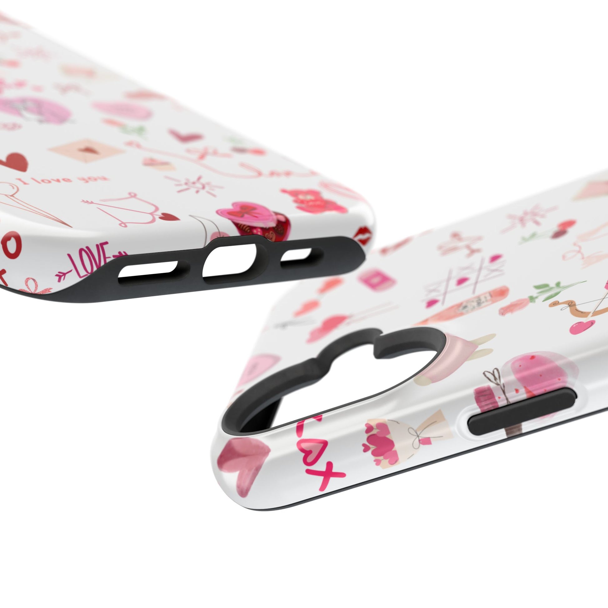 A slim, impact-resistant phone case wrapped in playful, hand-drawn love motifs — tiny hearts, kisses, love notes, bows, and pastel doodles scatter across a soft background. It feels light in the hand yet built to shield your phone from everyday bumps with a dual-layer construction. The artful, cheerful pattern adds a touch of romance to daily carry, whether you prefer a glossy shine or a muted matte finish. Bright, photo-quality printing keeps the pinks and reds vivid while the removable black TPU liner absorbs shocks and supports wireless charging. This case dresses your phone in a sweet, whimsical vibe that fits into moments of everyday affection and celebration.